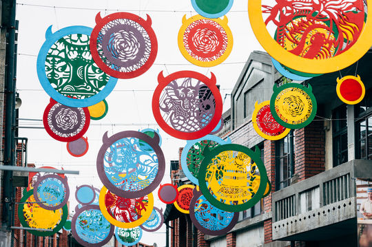 此創作期間適逢疫情爆發的初期,藝術家以「龍生九子」為題,將九子的個性與精神發揚,呼應台灣人所擁有的美好性格「靈活穩定勇猛謹慎果敢責任智慧勤奮愛」,而這也是我們能夠戰勝疫情的珍貴特質。裝置以三種尺寸,五種配色,六款圖樣,在長長的老街上,錯落於天際間,宛如一個個台灣靈魂匯聚而成的巨大力量。繽紛色彩,對比紅磚建築,有新舊融合之美,仰望天空,則以藍天為畫布,與親子同遊。