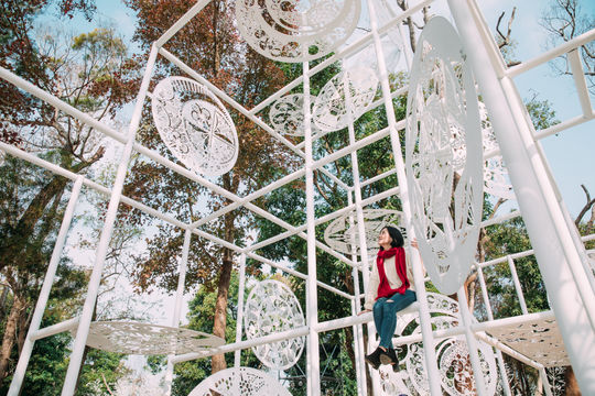 這一次的場域故事背景是后里森林,作品以此處常見的植物「相思樹」、「鳳凰花」及自然界中奇特樣貌的生物為靈感,搭配藝術家自身經驗中孩時最喜歡的爬格子遊樂器材,呼應2020藝術燈區主題「奇想國」。白色,除了象徵純潔快樂,更讓作品在白天裡「浪漫」入夜燈光打下後「魔幻」,成了能「24小時觀賞」的燈節藝術裝置。